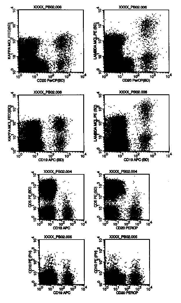 von kappa(FITC) und lambda(PE). Auf der linken Seite oben die kappa/lambda-Darstellung aller MNC, darunter die kappa/lambda Darstellung der Population der CD20+/CD19- Zellen, dann folgt die Population der CD20-/CD19+ Zellen. Im linken untersten Dotplot sind diese Populationen definiert.