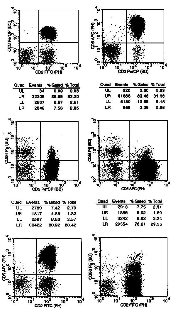 CD5-Verlust der T-Zellen nachzuweisen. In der obersten Reihe sind es im linken Dot-Plot im linken oberen Quadranten die CD2negativen CD3positiven T-Zellen. In diesem Quadranten findet man normalerweise nur sehr wenige Zellen. Im rechten Plot sieht man meist wenige Zellen in den Quadranten UL und LR. Im UL kann man aber manchmal CD3negative, CD5positive Zellen finden. Gerüchteweise können das aktivierte NK-Zellen sein. Tatsächlich finden wir bei hohen NK-Zellzahlen manchmal höhere Anteile in UL (und natürlich bei CD5+ CLL). Im LR (CD5-CD3+) kann man auch öfter bis zu 5 oder 10% T-Zellen finden.