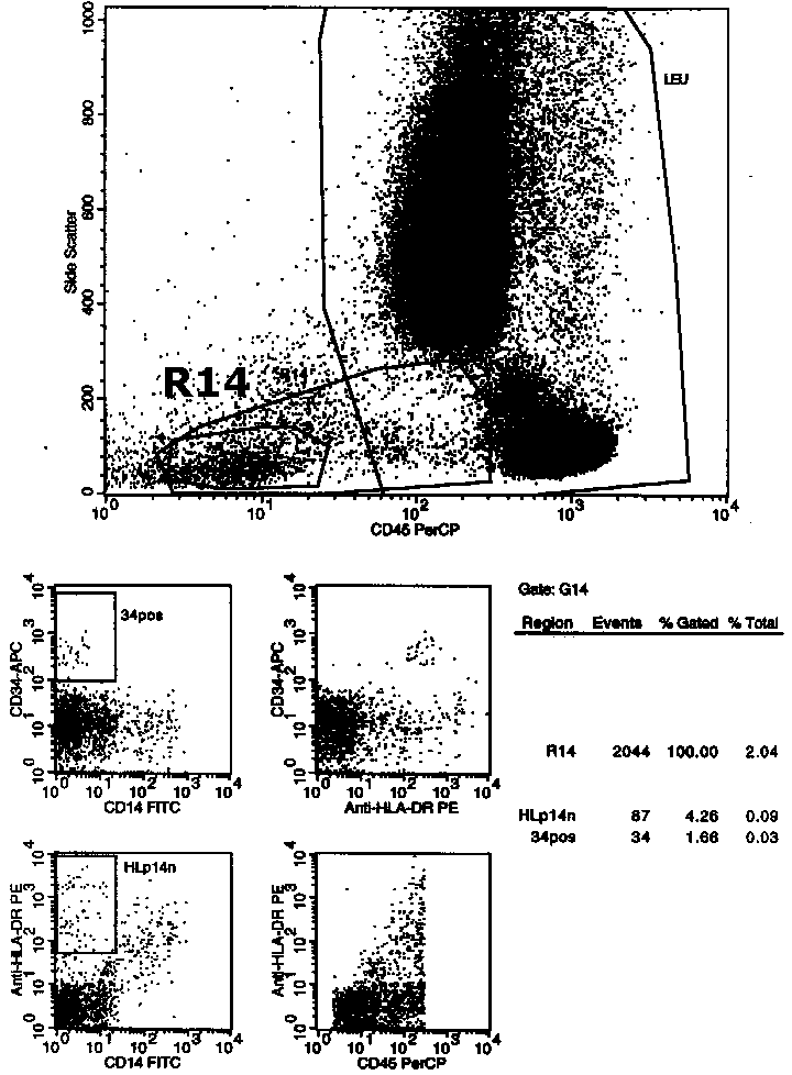 ![]() Obwohl mit dem Panel in erster Linie reifere Lymphome gesucht werden, suchen wir auch nach unreifen Zellen, wobei die Darstellung CD45 gegen Side Scatter am hilfreichsten ist. Abnorme unreife Zellen findet man meist in der als R14 bezeichneten Region. Leider findet man dort auch normale unreife Vorstufen, Plasmazellen (CD38+++) und Basophile (HLA-DR negativ). Auf den CD34er darf man sich bei der Suche nach unreifen Zellen/Blasten nie verlassen, er ist oft negativ! |