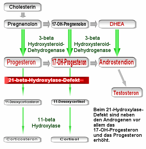 der Defekt bei der 21-Hydroxylase (genauer: 21-beta-Hydroxylase). Etwa jeder Vierzigste